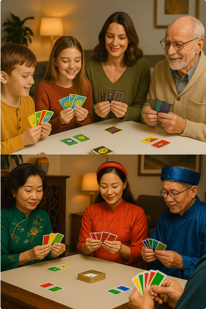 Hoewel Four Colors in de spelwereld vooral wordt gelinkt aan UNO, heeft de benaming in andere spelculturen een veel rijkere en oudere betekenis. In Vietnam verwijst het naar het traditionele kaartspel Tứ Sắc, een kaartspel dat al generaties lang populair is in het zuiden van het land. Dit is met name het geval in de regio rond Huế. Dit spel wordt gespeeld met 112 kaarten in vier kleuren (rood, geel, groen en wit). Het combineert elementen van Mah-Jong en Chinese schaken tot een strategisch geheel. Elke speler leidt als het ware een leger bestaande uit verschillende rangen, van generaal tot voetvolk, en probeert winnende combinaties te vormen zoals trio’s, kwartetten of specifieke sets. Het doel is om alle waardeloze kaarten uit de hand te verwijderen door logische verbanden en meldcombinaties te creëren. Waar UNO en Four Colors vooral draaien om snelheid en pesten, draait Tứ Sắc om strategie, geheugen en het tactisch afleggen van kaarten. Beide spellen delen de vier kleuren als uitgangspunt, maar qua speelstijl verschillen ze sterk.
