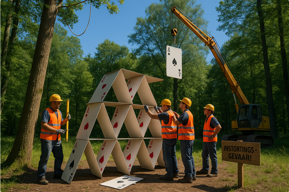 Dan stort het kaartenhuis op dat punt in en moet je opnieuw beginnen. Afhankelijk van de versie moet je herbeginnen vanaf de laatst stabiele laag of moet je volledig opnieuw beginnen.