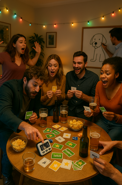 Switch is een verrassend kaartspel waarbij de spelers niet één spel spelen, maar voortdurend schakelen tussen maar liefst veertig verschillende minivarianten. Elke ronde brengt een nieuwe opdracht, waardoor creatief denken, improvisatievermogen en humor voortdurend op de proef worden gesteld. Het spel bestaat uit diverse kaarttypes, zoals woordkaarten, cijferkaarten, sterkaarten en ja/nee-kaarten. Deze kaarten zorgen ervoor dat de uitdagingen er telkens weer anders uitzien. Switch is geschikt voor groepen van vier tot acht spelers vanaf tien jaar en heeft een flexibele speelduur van twintig tot zestig minuten. Dankzij de korte uitleg en snelle opzet is het een ideaal spel voor een avondje met vrienden.