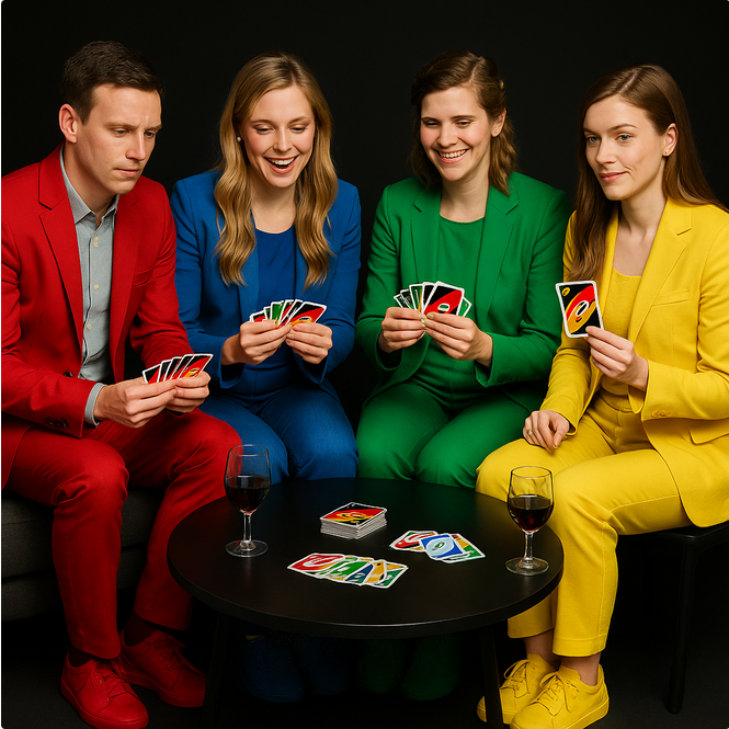 Four Colors is een online kaartspel dat sterk lijkt op Uno, maar dat wel enkele opvallende verschillen kent. Net als bij Uno is het de bedoeling om al je kaarten zo snel mogelijk kwijt te raken door in elke beurt een kaart op de stapel in het midden te leggen die past bij de kleur of het cijfer van de vorige kaart. Trek je een kaart als je niets kunt spelen, dan blijf je gewoon aan de beurt tot je iets kunt afleggen. Four Colors onderscheidt zich echter door zijn eenvoud: de kaarten zijn niet voorzien van personages of thematische afbeeldingen. Het heeft dus strakkere, meer minimalistische vormgeving. Bovendien worden sommige functies van actiekaarten aangepast of vereenvoudigd, zoals het skippen van een beurt of het laten trekken van kaarten. Over het algemeen voelt Four Colors als een meer gestroomlijnde variant van Uno, ideaal voor kortere potjes met een hoog tempo.
